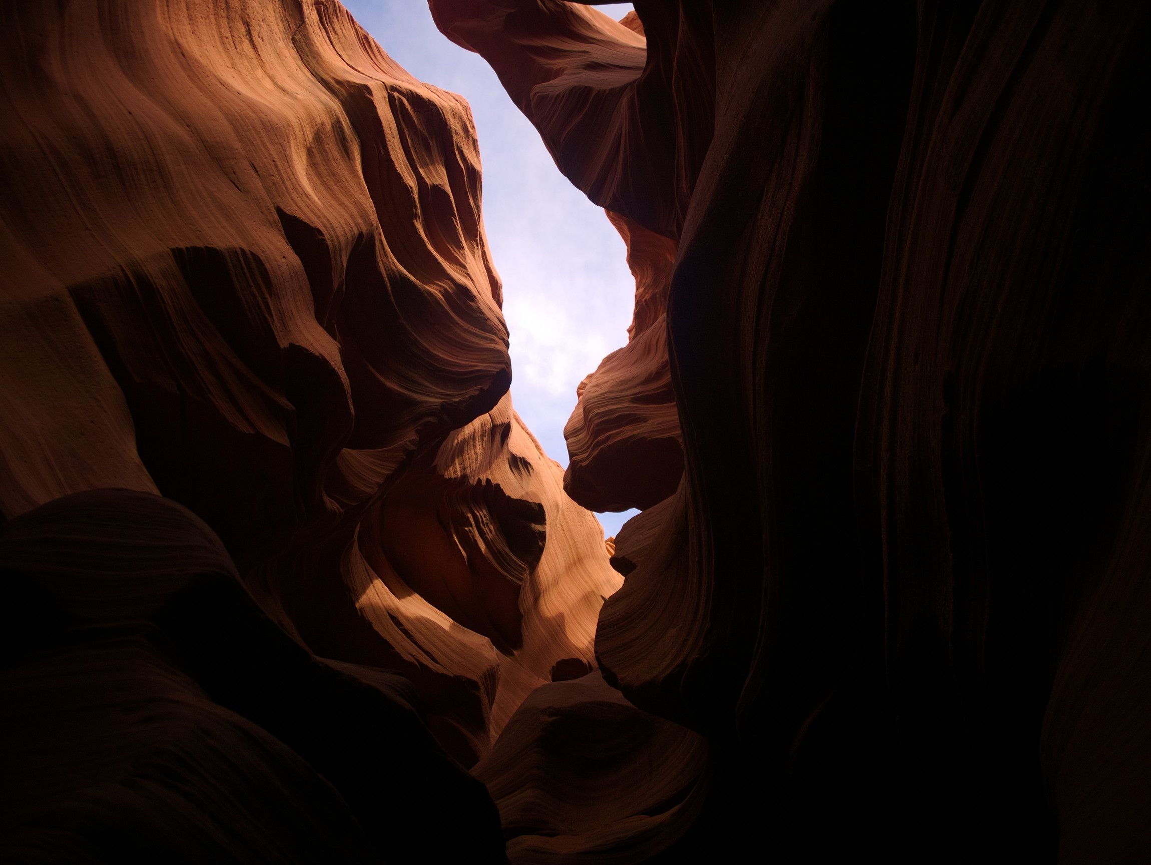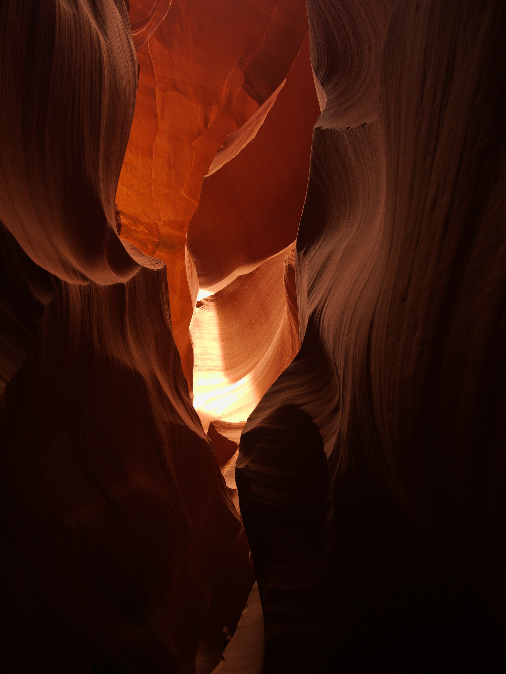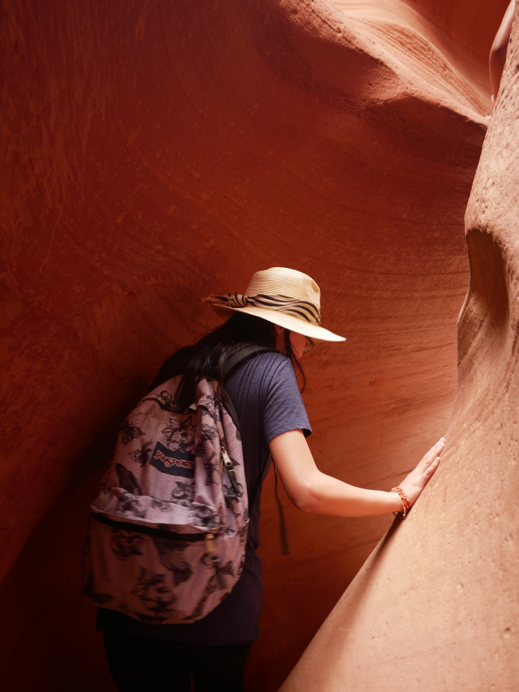 来回折腾了几个回合,最终终于决定把下羚羊谷和白沙合并在一起,因为他们有不少的相似点,最主要的共同点就是:在里面当时当下的感受没有看照片的感受好。 羚羊谷的出名主要就是来自于著名摄影师Peter Lik的一组非常出名的照片,岩石的纹路一如美女柔滑的长发和美丽的侧脸,和天使的灵魂一般带着紫红色的绚丽线条。其中最最出名的莫过于其中有一幅画在几年前拍卖拍出6.5百万美金的高价。 或许是因为被他的摄影作品洗脑洗眼太多,一直对于羚羊谷的想象都是必然伴随着浓郁的色彩,优美柔和的线条。当然,事实就是失望而归了。 首先,因为这个景点之出名,因为我们的时间正好又是暑假,所以我们不得不在有预约的情况下排了2小时左右的队,才能够在导游的带领下组成一个10左右的团进入谷底。因为参观人数之多,每个团队在谷内的每个点的时间都是严格控制的。所以导游主要有两个作用(在谷底的时候): 一来就是告诉你怎么调整手机或者相机的设置进而让照片拍起来色彩更加迷人,二来就是控制每个成员在谷底拍照的时间,当然还附送帮你们拍合照。正因为导游的存在,我和顾先生在羚羊谷拍了我们整个旅程中仅有的几张正常合照。