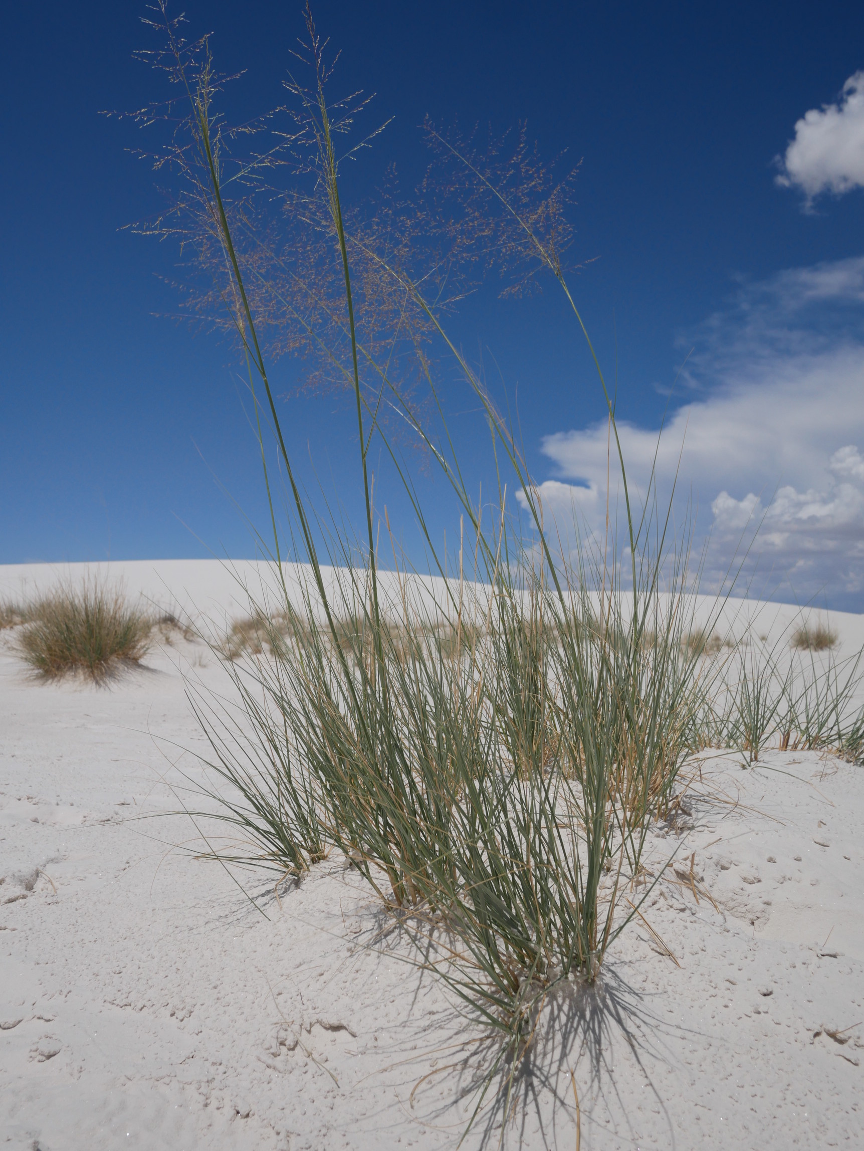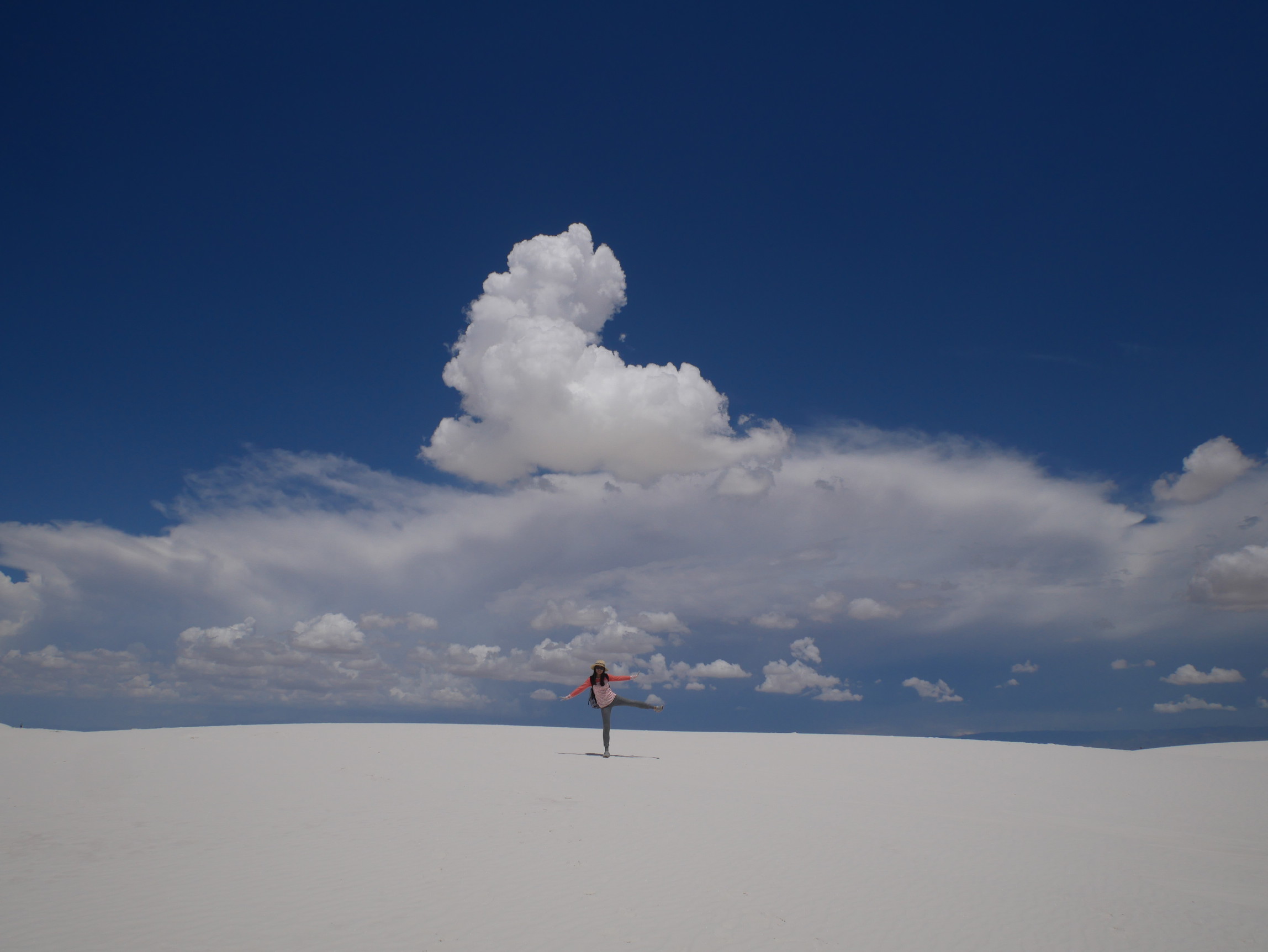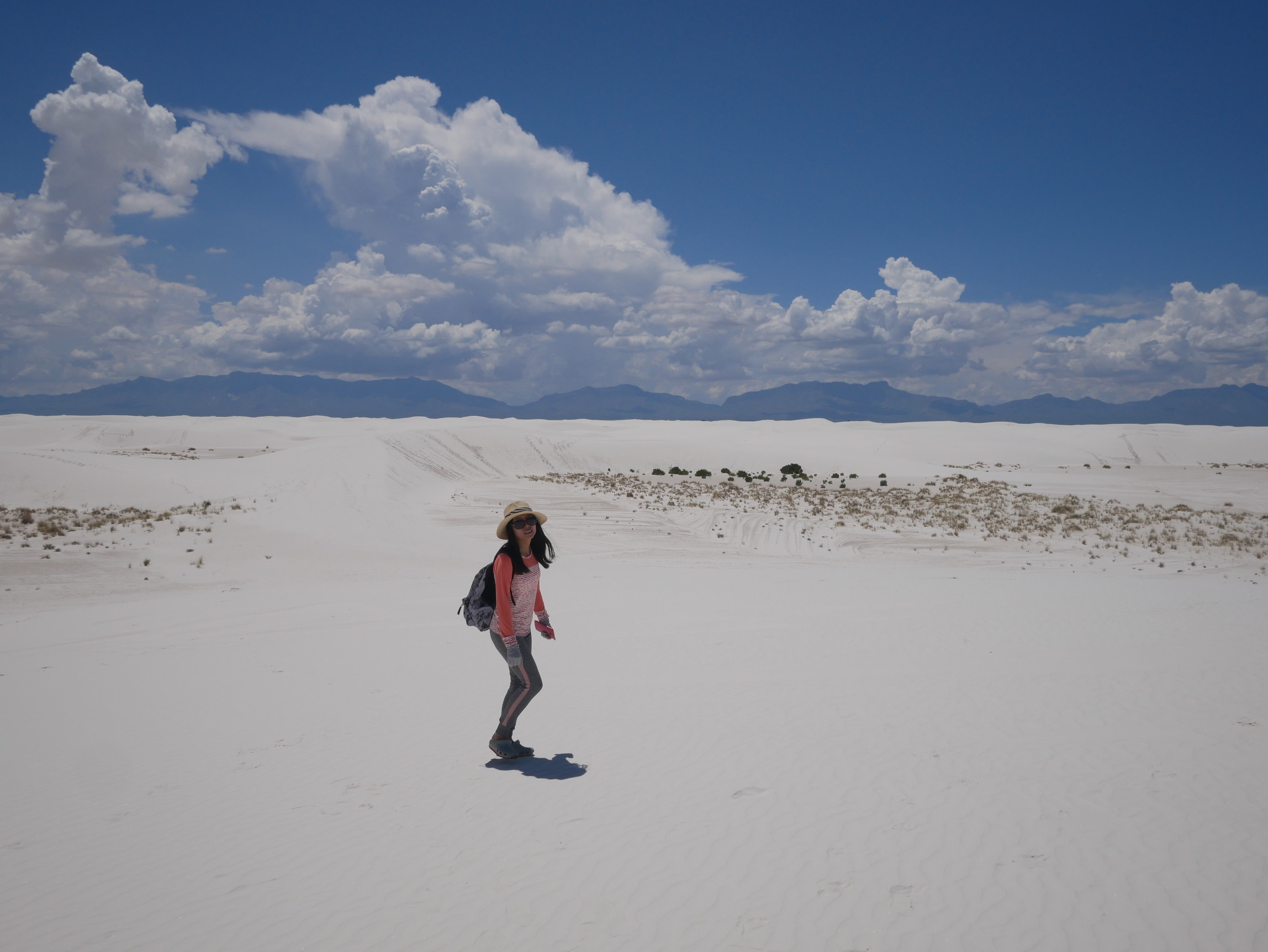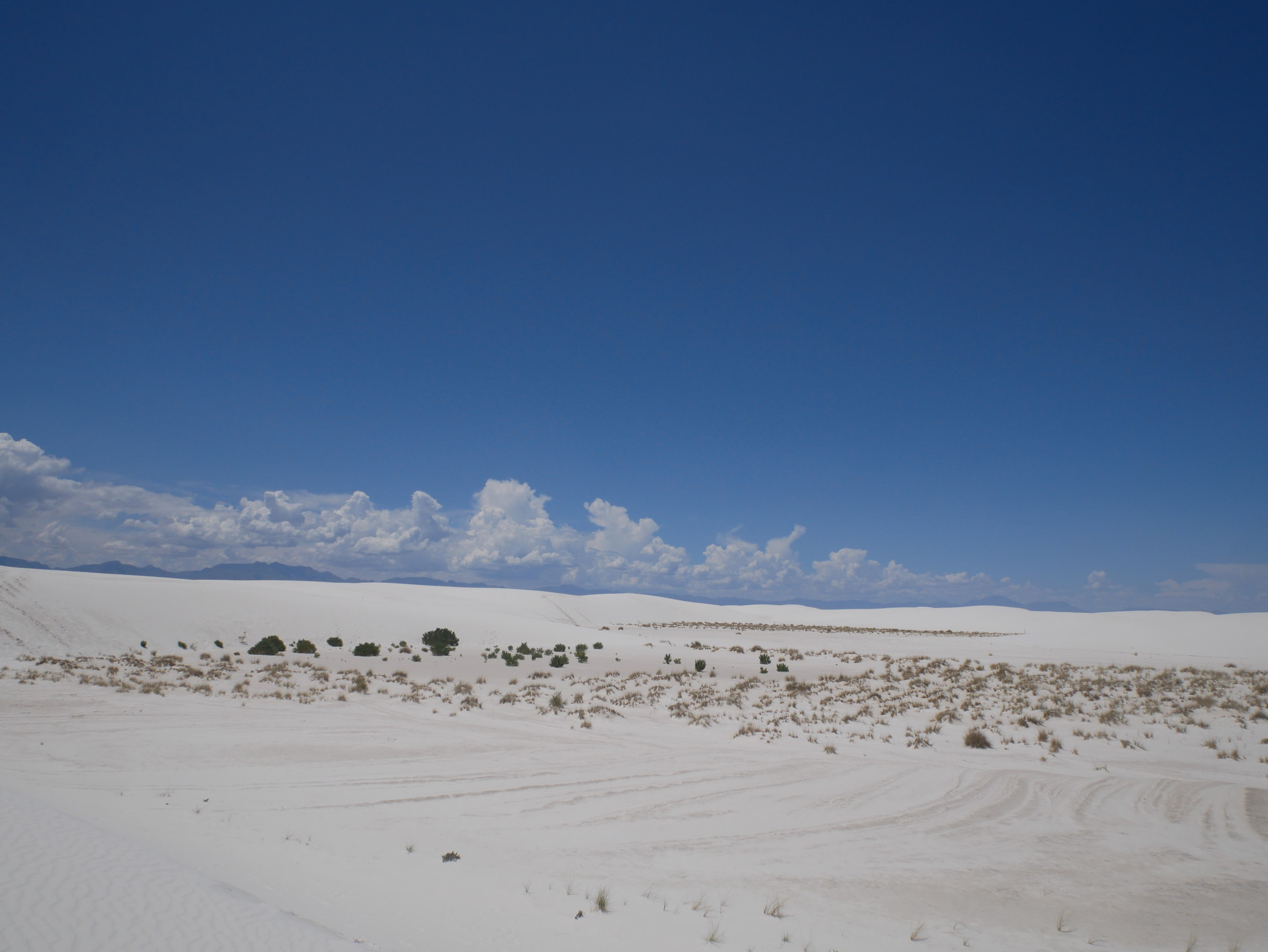 新墨西哥州并不是一个热门的旅游地点,实际上在新墨西哥州境内最出名的除了地下洞穴,就是白沙公园。其实白沙并不是国家公园,它是national monument,实在不知道怎么翻译显然不是纪念碑也不是保护文物。为了简化,就称之为白沙公园吧。 曾经看过很多关于白沙的照片,一片洁白如雪地一般的沙滩/沙漠在炎热新墨西哥州中部盆地,这种视觉上的冲击和对比很有震撼力。那里的白沙是一种石膏岩晶体,石膏是水溶性的,所以很难形成大面积的晶体进而形成大规模的沙滩/沙漠。而这里的白沙主要是由于这里曾经是一片湖,湖水减少蒸发,所以溶解在湖水中的石膏岩从水中结晶出来。随着时间的推移,越来越多的湖水消失蒸发,而结晶形成的洁白沙子堆积集中在湖底形成了这么大规模的白沙。这些白沙堆形状各异,主要是在气候(尤其是风)的作用下不断的变化和移动,因为季节的关系吧,我们去的时候看到的主要是圆形的沙丘。