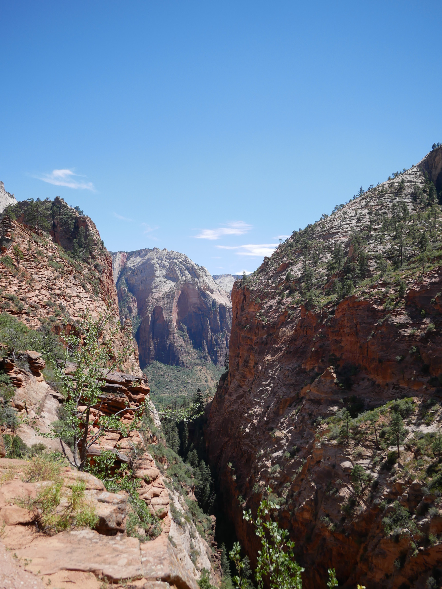 仔细的回忆起来,这段布道主要分为两种类型:一种是狭窄的小路两边都是悬崖,布道自身不足2米宽;另外一种就是30度左右的斜坡毫无障碍的连着悬崖。无论是哪种,都让我心惊胆颤,丝毫不敢松懈。即使顾先生,我也可以合理的猜测他的内心谨慎,因为在攀爬过程中,一张照片都没有拍。 千难万险爬到顶部的我一度死活赖在一个小矮树阴下寻找安全感,坚决不再往悬崖边走一步。同时和我一样赖在小歪脖子树下坚决不动的还有一个大概12-13岁左右的小男孩,我们俩背靠背的坐在整个Angel’s Landing最宽的平台处,面对着同样来自同行者的怂恿。顾先生一遍一遍的劝我,99步都走了,再走几步就可以看到完全不一样的风景了。我背面的小男孩同样一次次的坚决拒绝不断怂恿他的妈妈,那一刻我真的感受到了一种同病相怜之感。不知道是怂了多久,我和小男孩还是艰难的走向了最后的10米长的,这最后的10米是没有扶手没有铁索,两边都是悬崖的十米。顾先生的视频里,我努力的表现出平静,表现出每一步的坚定和踏实。事实上,腿是软的,心里无限翻腾的几个字:“让我飞下去吧!”。