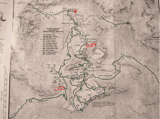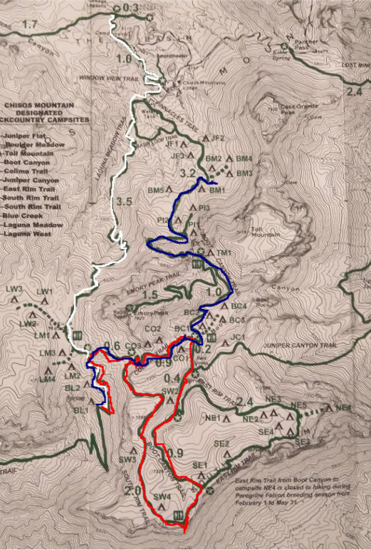 我们的两个营地分别位于上图中框出来的BL1和第二晚的BM1,圈出来的是我们的起点。这就意味着我们当天负重登山距离并不会很长大约7-8英里(12公里左右),就可以到达营地。顾先生提议我们沿着下图中白线所示路线,背着登山包到达第一天的营地,放下沉重的行李,然后轻装沿着红色线所标记路线去南部的顶峰转一圈后回到营地休息过夜。第二天只需要沿着蓝线标示的路线在天黑前到达第二个露营地点就可以了。不论是当时还是时候细细想来,这个决定都是最明智的没有之一。红线标示的South Rim是最美的观景点,但也是海拔~2200米(~7300feet)的相对高点和徒步难度比较大的位置。这样的安排可以保证我们看到了最美的风景但也保留了足够的体力。
