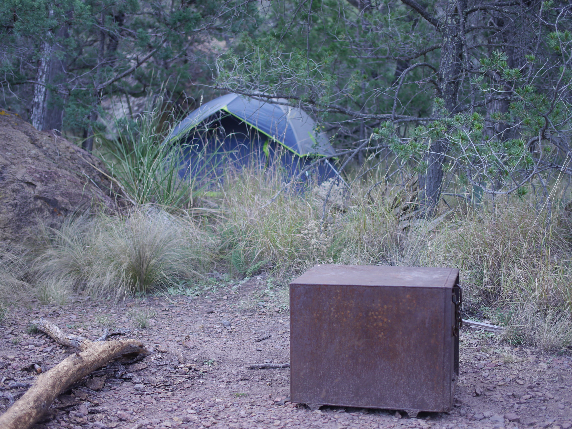 埋着头就这么咬牙走到了第一个露营地。一路上我听到最多的话就是顾先生让我多喝水,一直就是一句话,你喝的水不够。我这才知道可以根据上厕所的次数来判断喝水够不够。下午接近一点我们才到达露营地,按照要求,我们需要把所有带有味道的东西放到防熊箱里。然后拿着少量的水开始下午的徒步登山之旅。